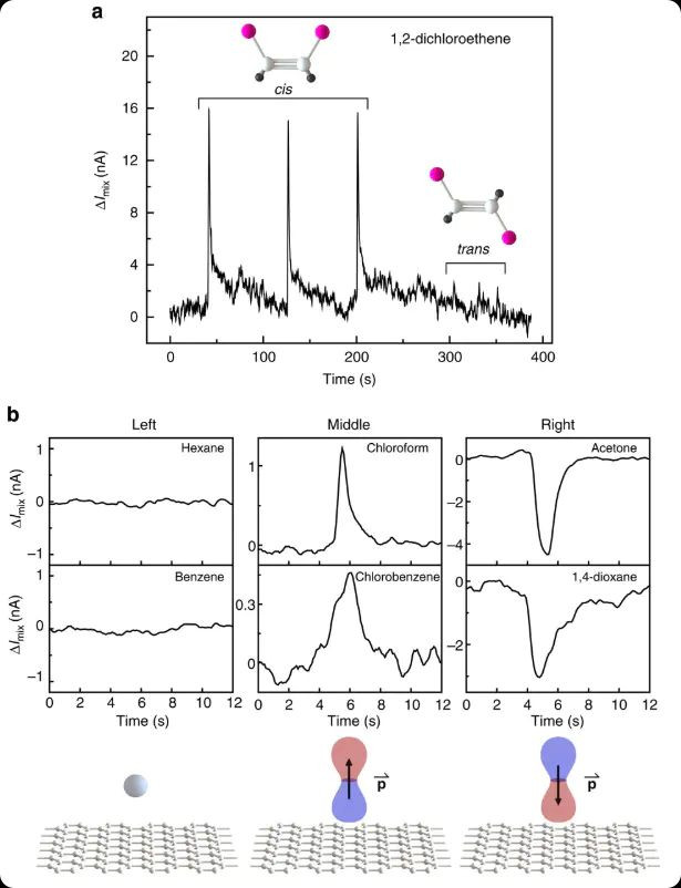 DOI:10.1038/srep14358 非极性分子(Nonpolar Molecules):如果分子中所有键偶极矩的矢量和恰好为零,那么分子就是非极性的,其分子偶极矩为零。这通常发生在高度对称的分子中。 例如二氧化碳(CO2),虽然C=O键本身是强极性的,但CO2分子是直线型结构,两个C=O键偶极矩大小相等、方向相反,其矢量和正好为零。另一个经典例子是四氯化碳(CCl4),其分子构型为正四面体,四个C-Cl键的键偶极矩在空间上完美地相互抵消,导致分子整体不显极性。 因此,一个分子是否具有偶极矩,不仅取决于其化学键的极性,更关键的是取决于其三维空间构型。 偶极矩的应用 1. 预测物质的溶解性 “相似相溶”是化学中的一条重要经验法则。偶极矩是判断分子极性的直接依据。 具有较大偶极矩的极性分子倾向于溶解在极性溶剂中(如水、乙醇),而非极性分子则倾向于溶解在非极性溶剂中(如己烷、苯)。这是因为极性溶质分子与极性溶剂分子之间可以通过偶极–偶极相互作用(dipole-dipole interactions)来稳定体系,从而促进溶解。 2. 判断分子的几何构型 实验测定的偶极矩数据是推断和验证分子空间构型的有力工具。如果一个分子被测得具有非零的偶极矩,那么所有可能导致偶极矩为零的高度对称构型都可以被排除。 一个经典的例子是二氯乙烯(C2H2Cl2)的顺反异构体。顺式-1,2-二氯乙烯的两个C-Cl键偶极矩位于双键的同一侧,矢量和不为零,因此是极性分子。而反式-1,2-二氯乙烯的两个C-Cl键偶极矩方向相反,矢量和为零,是非极性分子。通过测量样品的偶极矩,可以有效地区分这两种异构体。